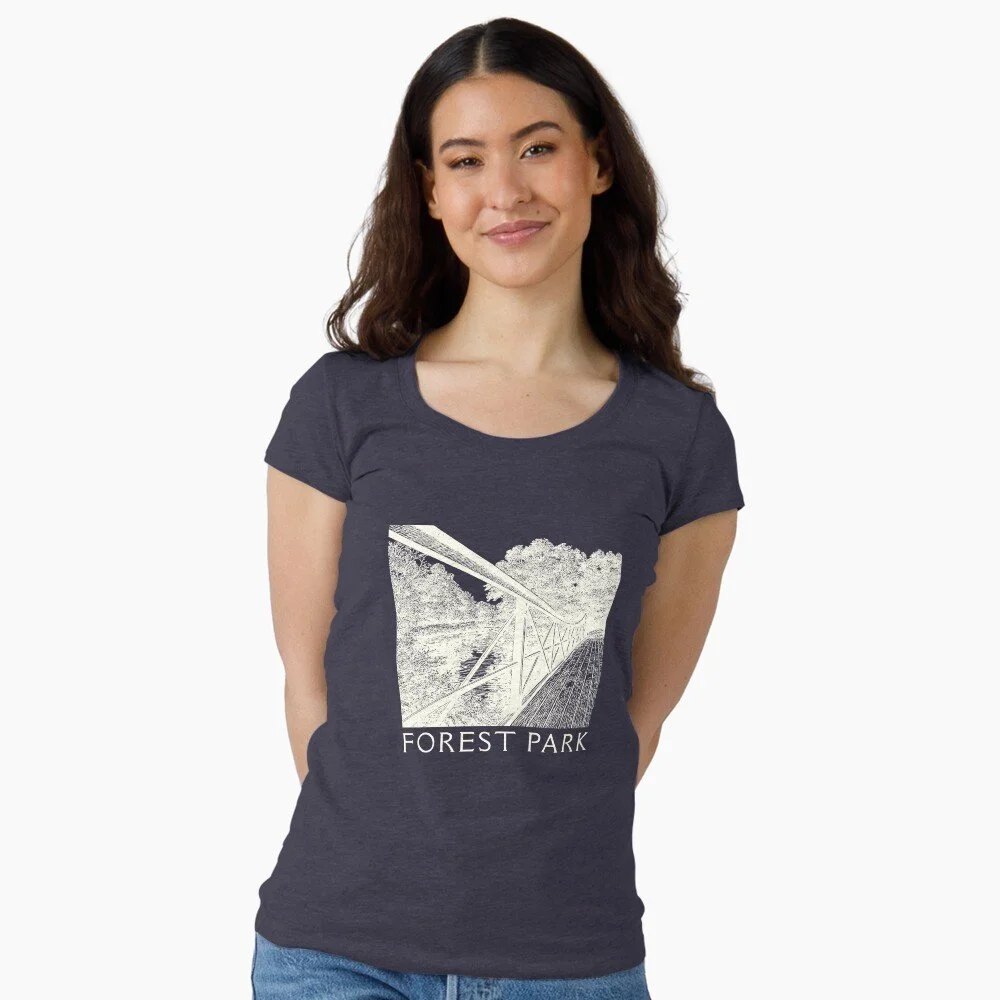 Illustrated photo of a Victorian footbridge built in the 1880s for pedestrian access from a streetcar stop into Forest Park.